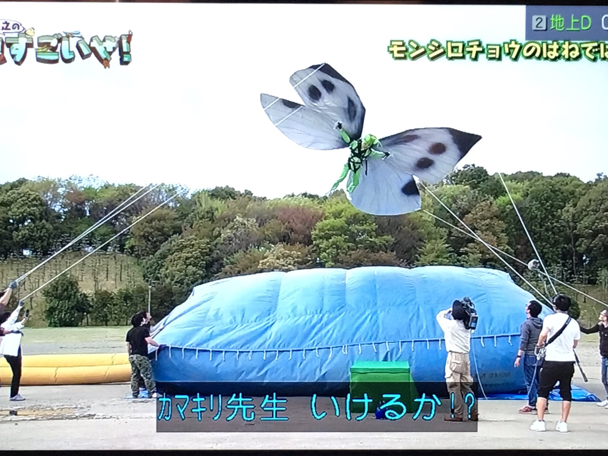 「モンシロチョウの被り物してクレーンに吊られるんですか?」